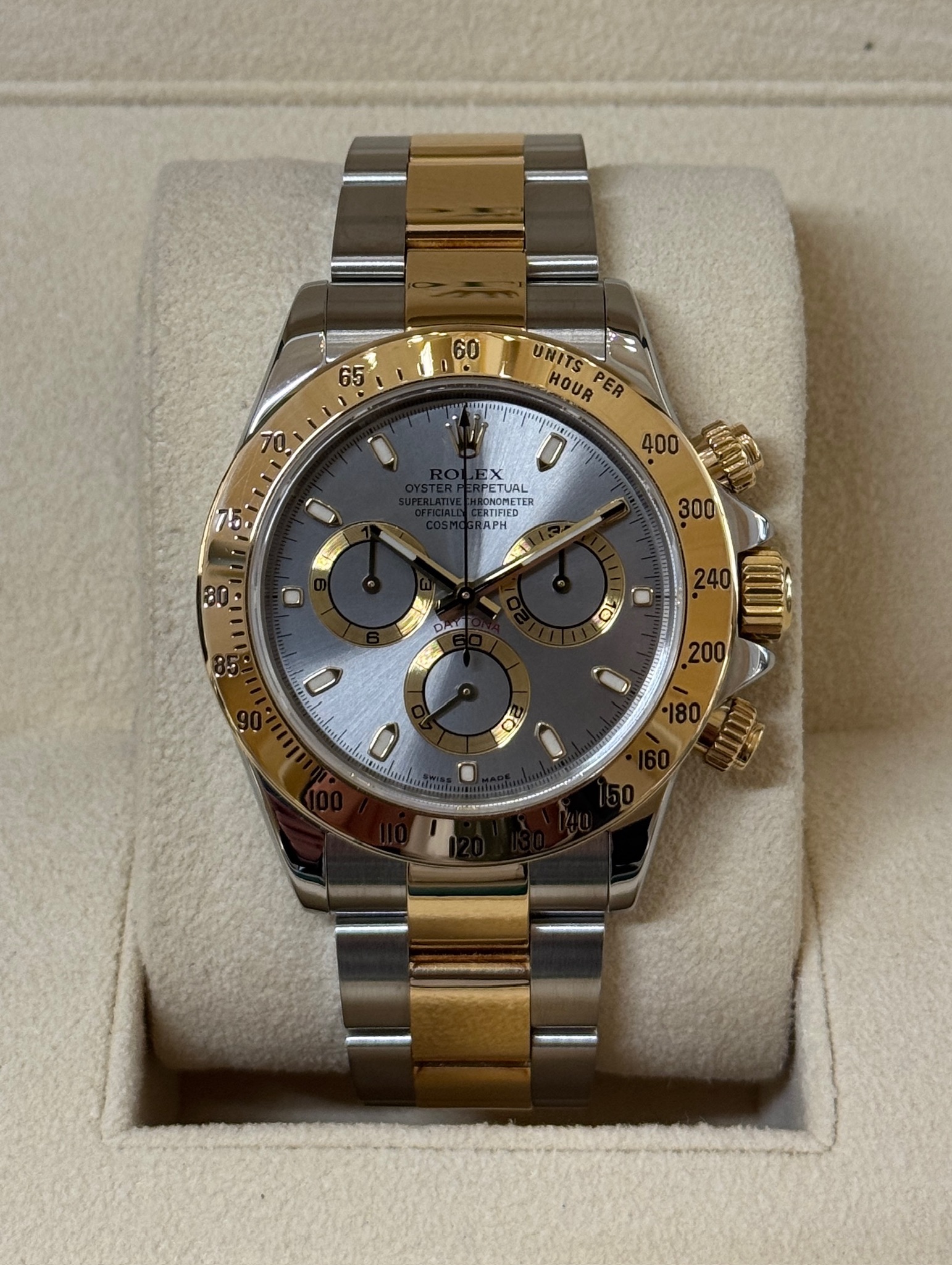Introducing the Rolex Cosmograph Daytona 116523, a timepiece that marries the thrill of motorsport with the elegance of horology. This two-tone chronograph is a symbol of Rolex’s expertise, standing out with its chronometric precision and unfailing reliability.