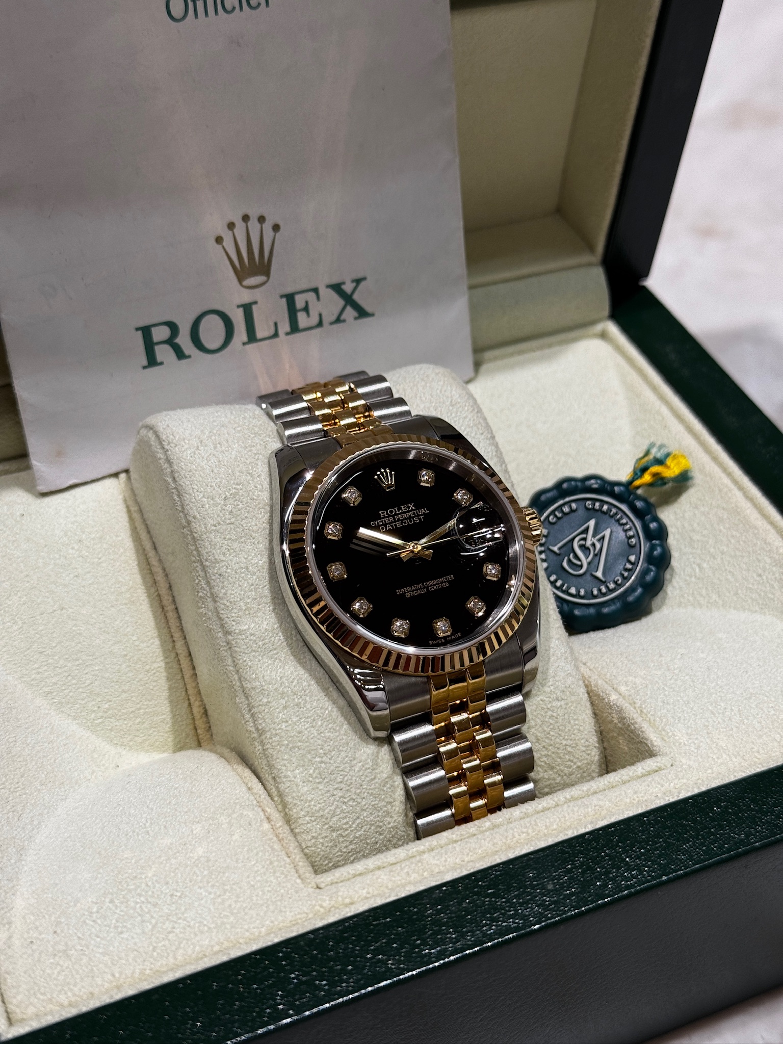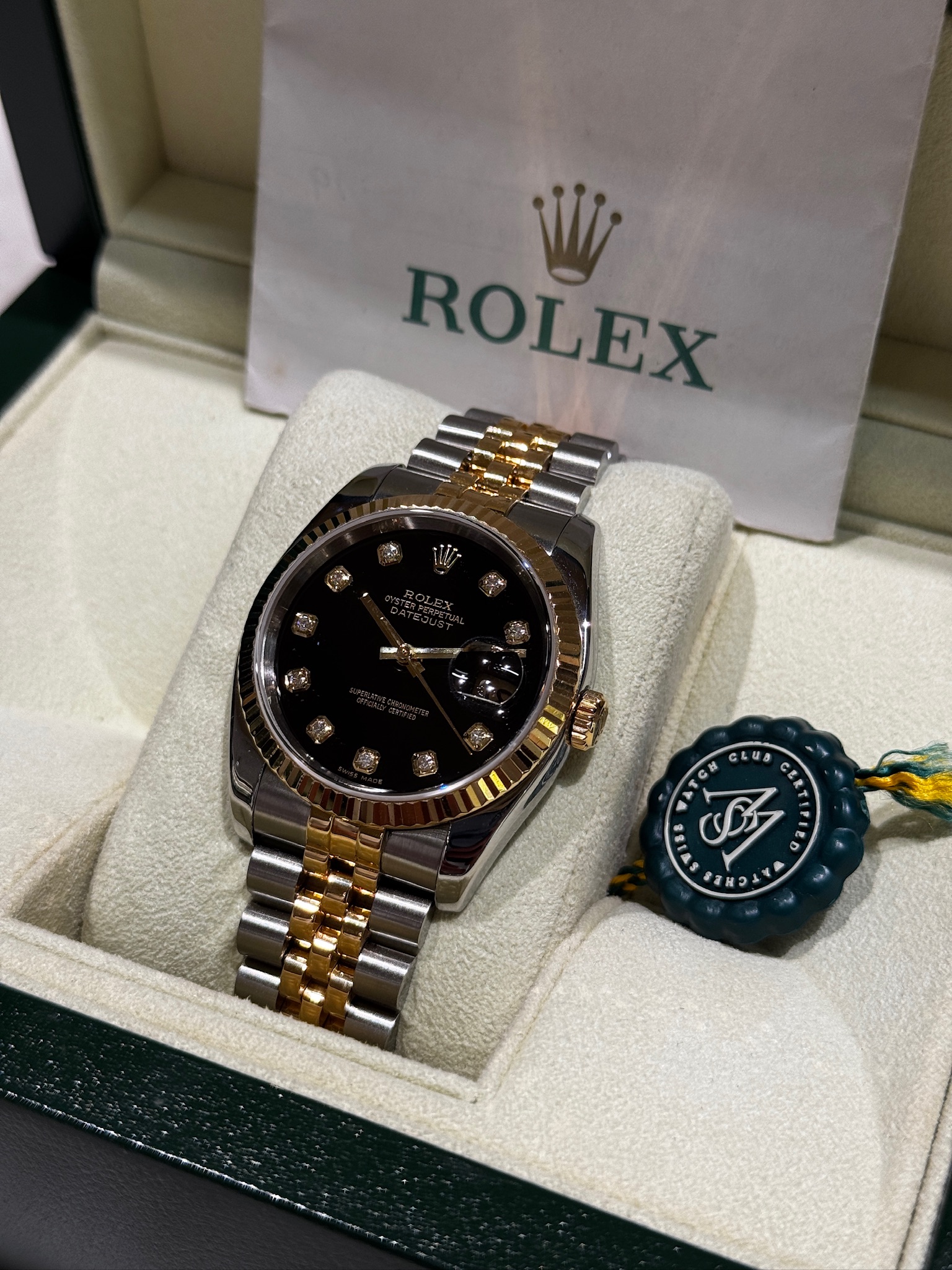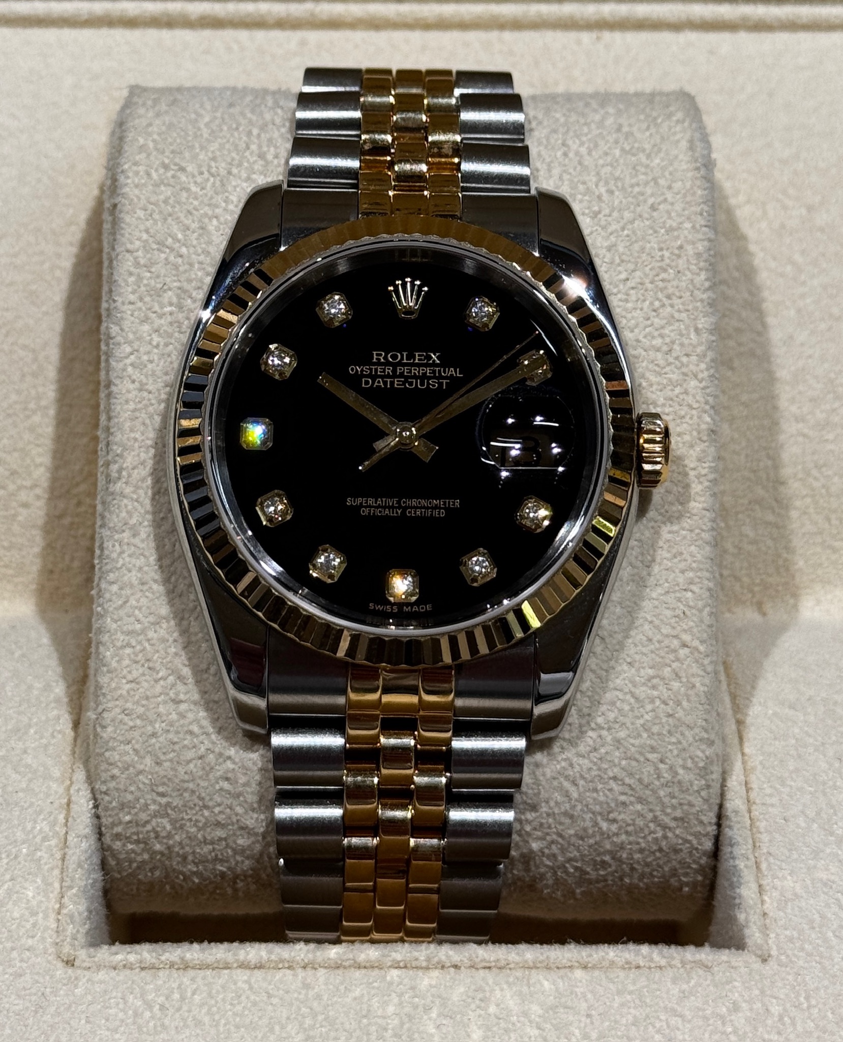 This Rolex Datejust 36mm, reference 116233, embodies timeless elegance and refined craftsmanship. Featuring a striking black dial adorned with factory-set diamond hour markers, this piece seamlessly blends luxury with everyday versatility. The iconic fluted bezel, crafted in 18k yellow gold, contrasts beautifully against the stainless steel and yellow gold Oyster case and bracelet, showcasing Rolex’s signature two-tone design. Powered by the reliable Rolex Caliber 3135 automatic movement, it offers precision and durability synonymous with the Datejust name. The scratch-resistant sapphire crystal and Cyclops date magnifier enhance both function and form, making this 116233 a sophisticated statement piece suited for any occasion.