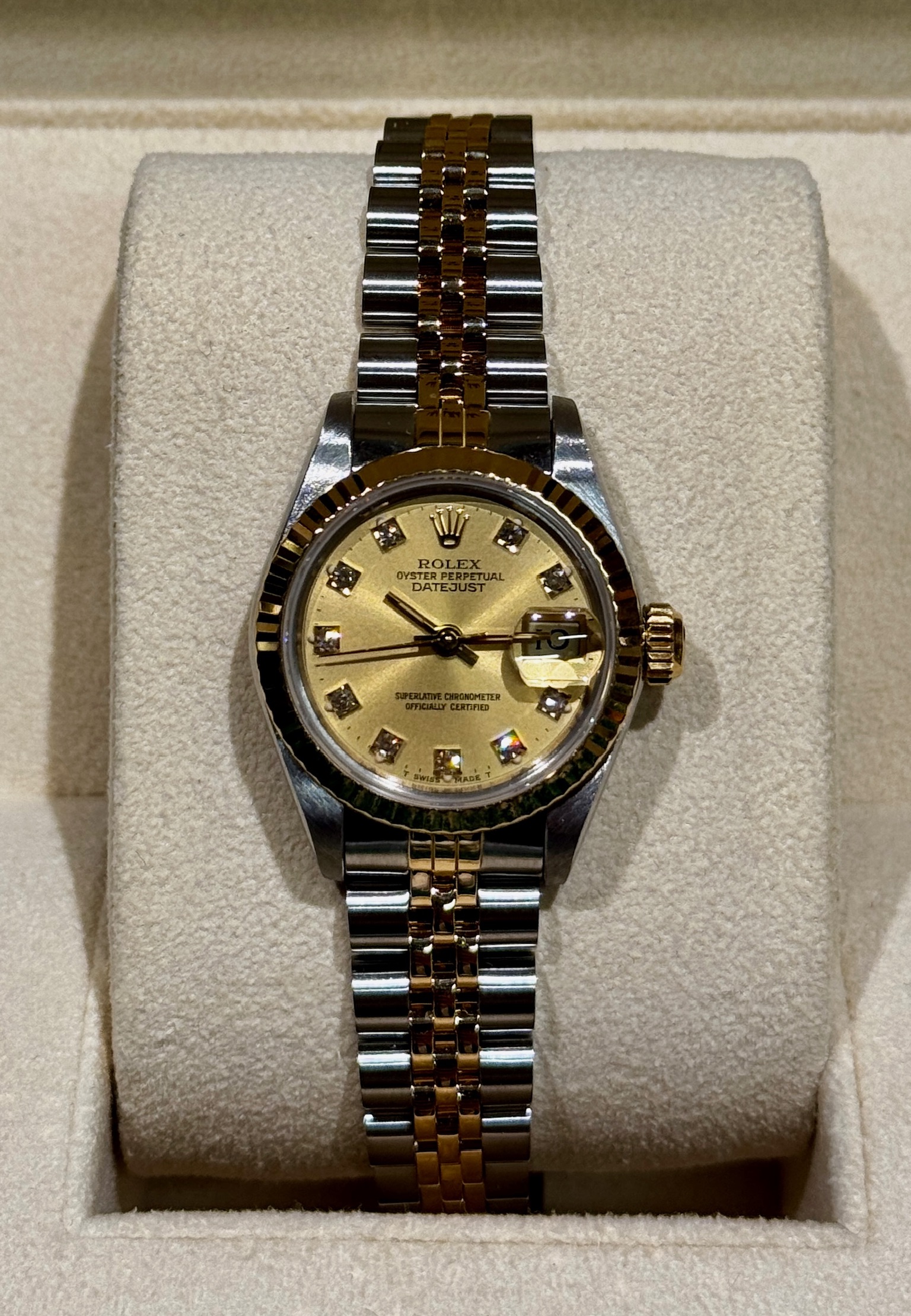 The champagne dial is adorned with diamond hour markers, adding a touch of sparkle to this refined piece. The Datejust Lady 26mm 69173 is powered by a self-winding automatic movement that displays the date at 3 o'clock.