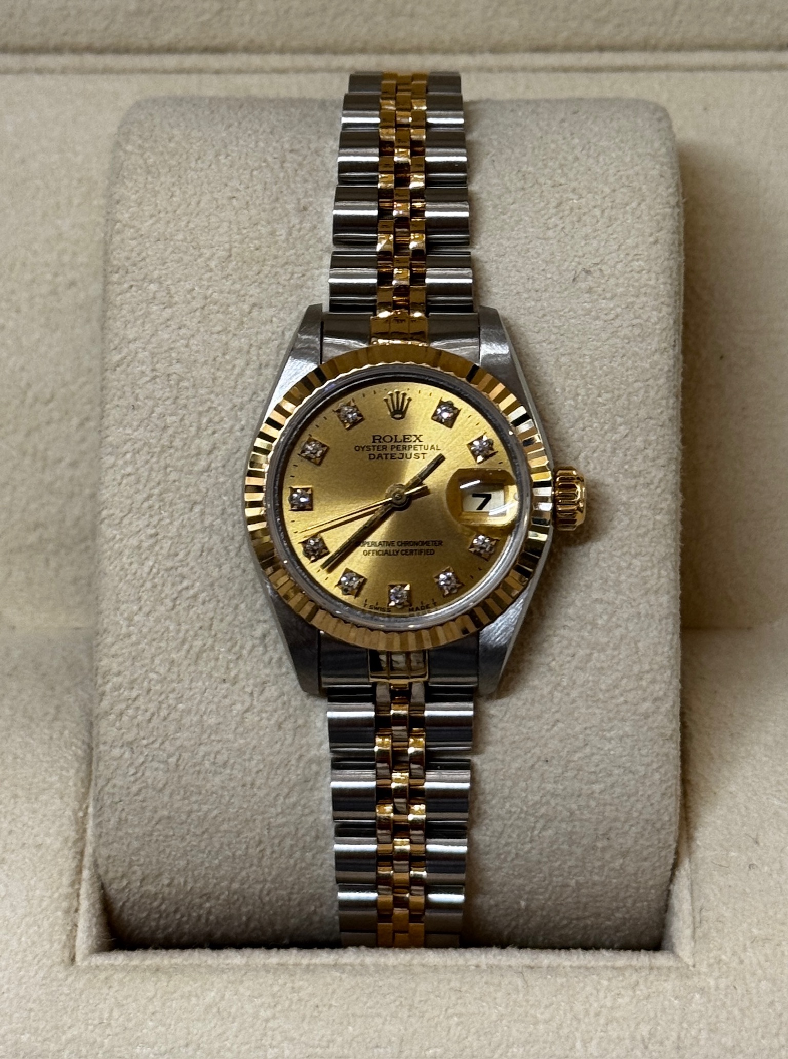The champagne dial is adorned with diamond hour markers, adding a touch of sparkle to this refined piece. The Datejust Lady 26mm 69173 is powered by a self-winding automatic movement that displays the date at 3 o'clock.