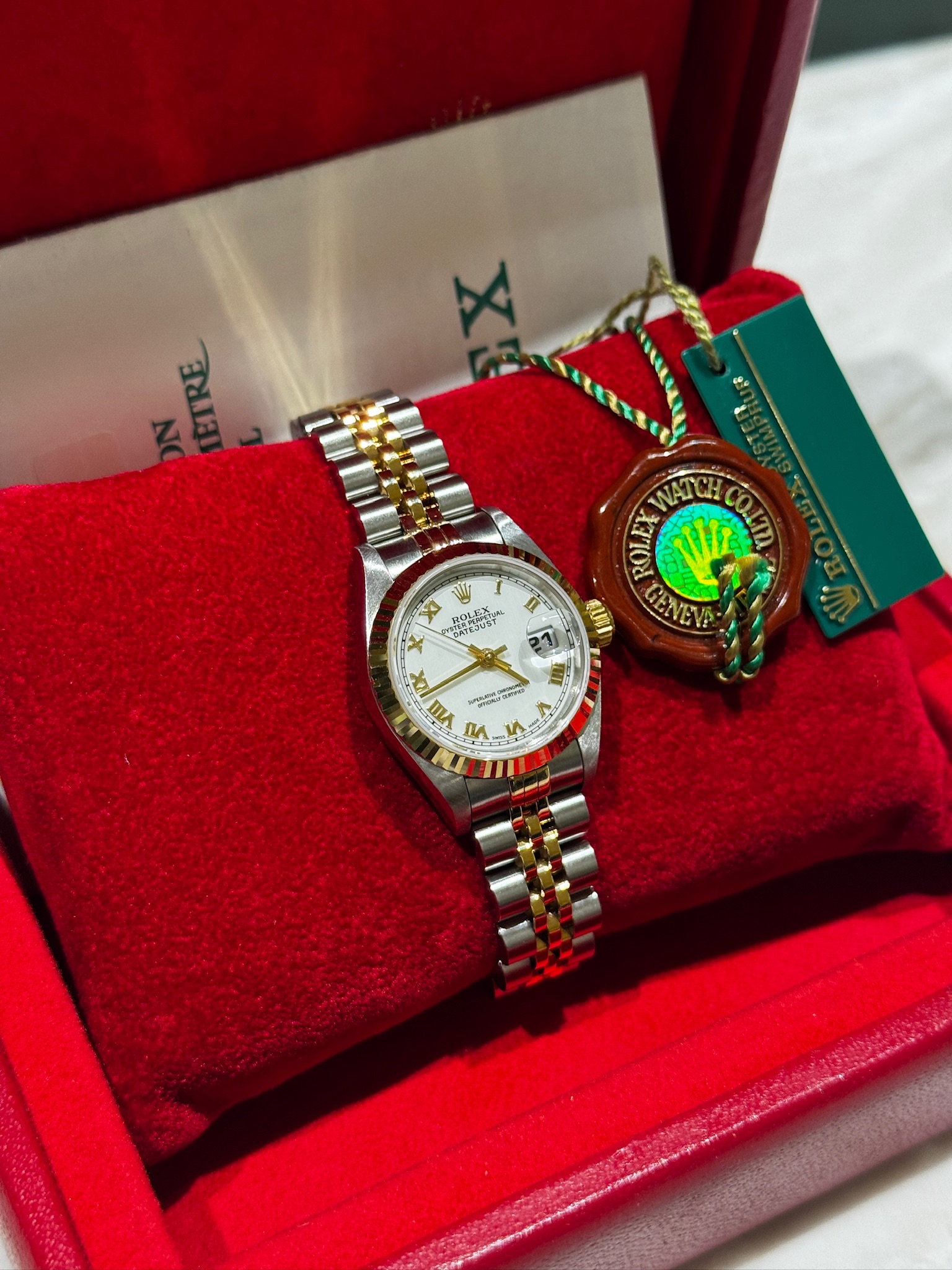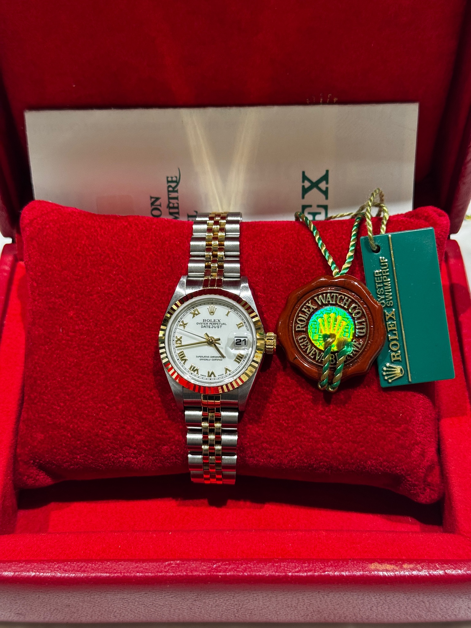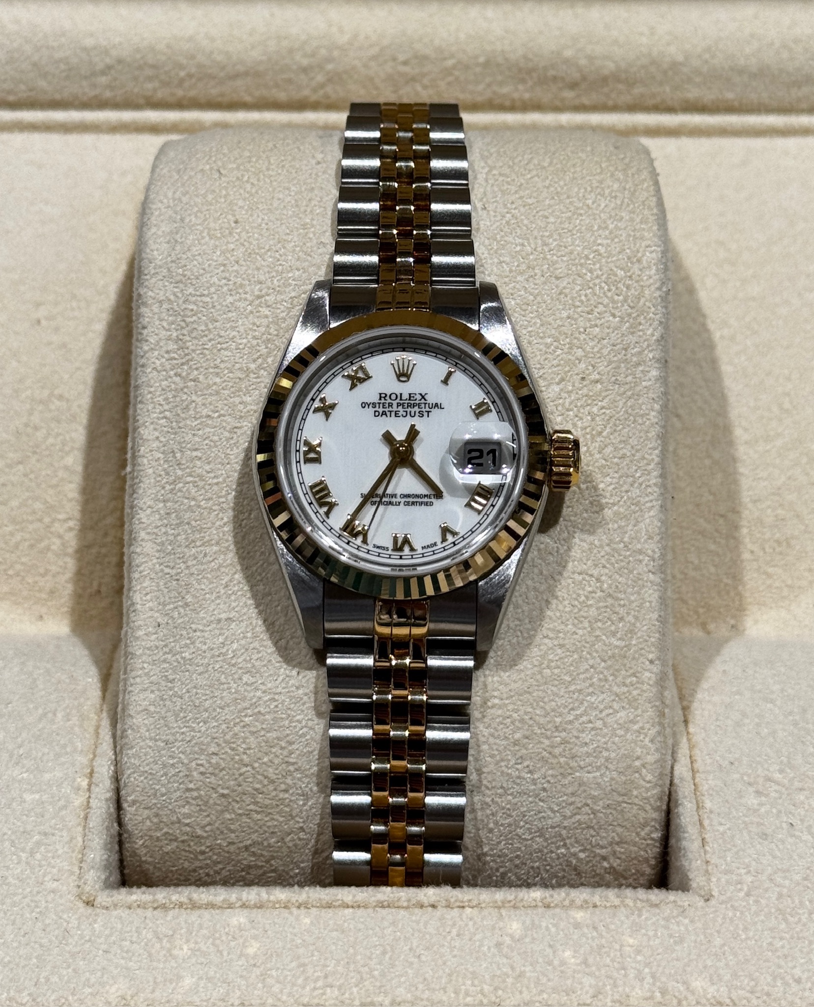 On the white dial, elegant Roman numeral hour markers evoke tradition and sophistication. The two-tone Jubilee bracelet ensures both comfort and timeless elegance. Despite the allure of other Rolex models, the Lady-Datejust remains a beloved timepiece, embodying luxury and enduring appeal.
