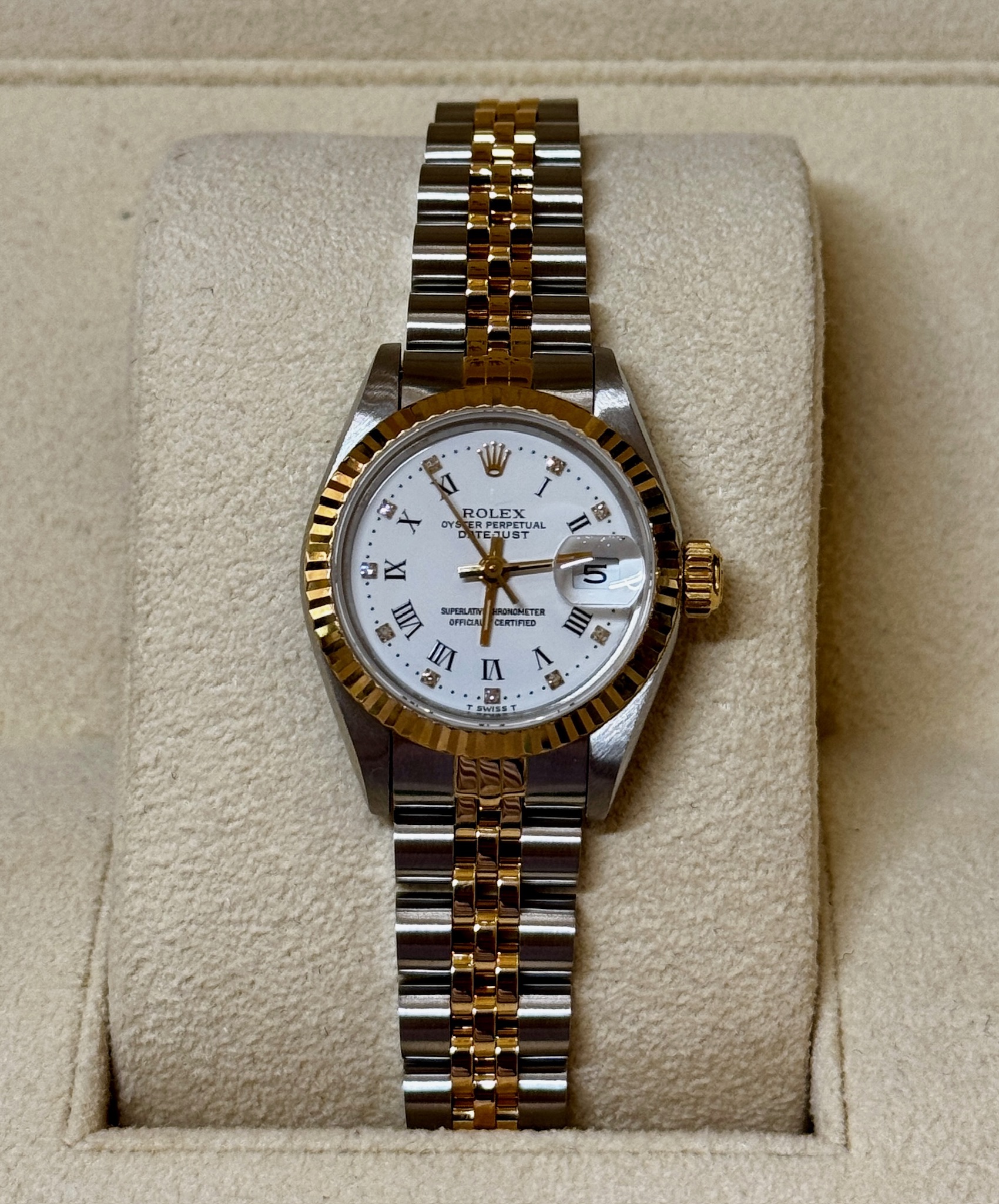 The white dial is adorned with special roman numeral and diamond hour markers, adding a touch of sparkle to this refined piece. The Datejust Lady 26mm 69173 is powered by a self-winding automatic movement that displays the date at 3 o'clock.