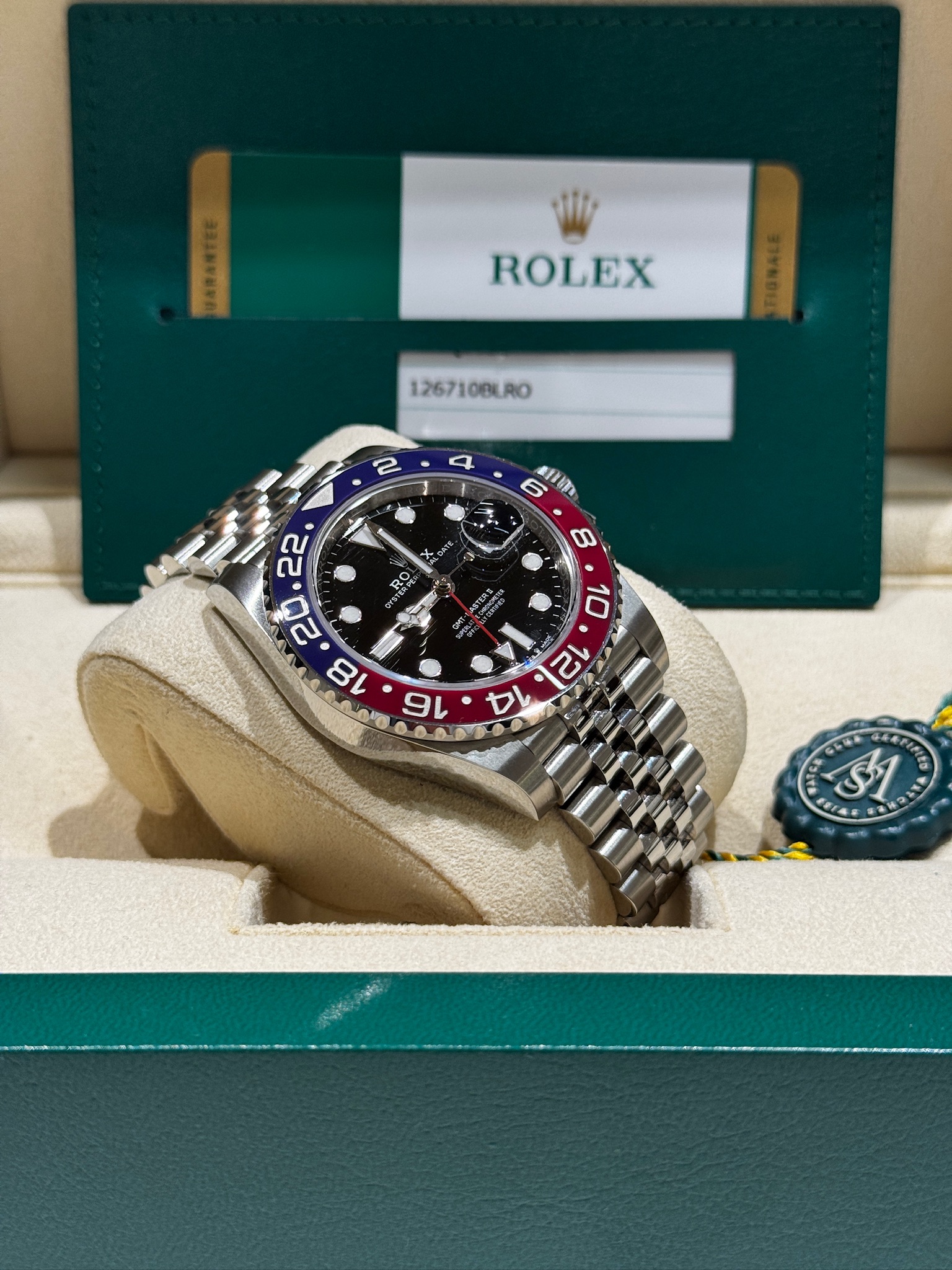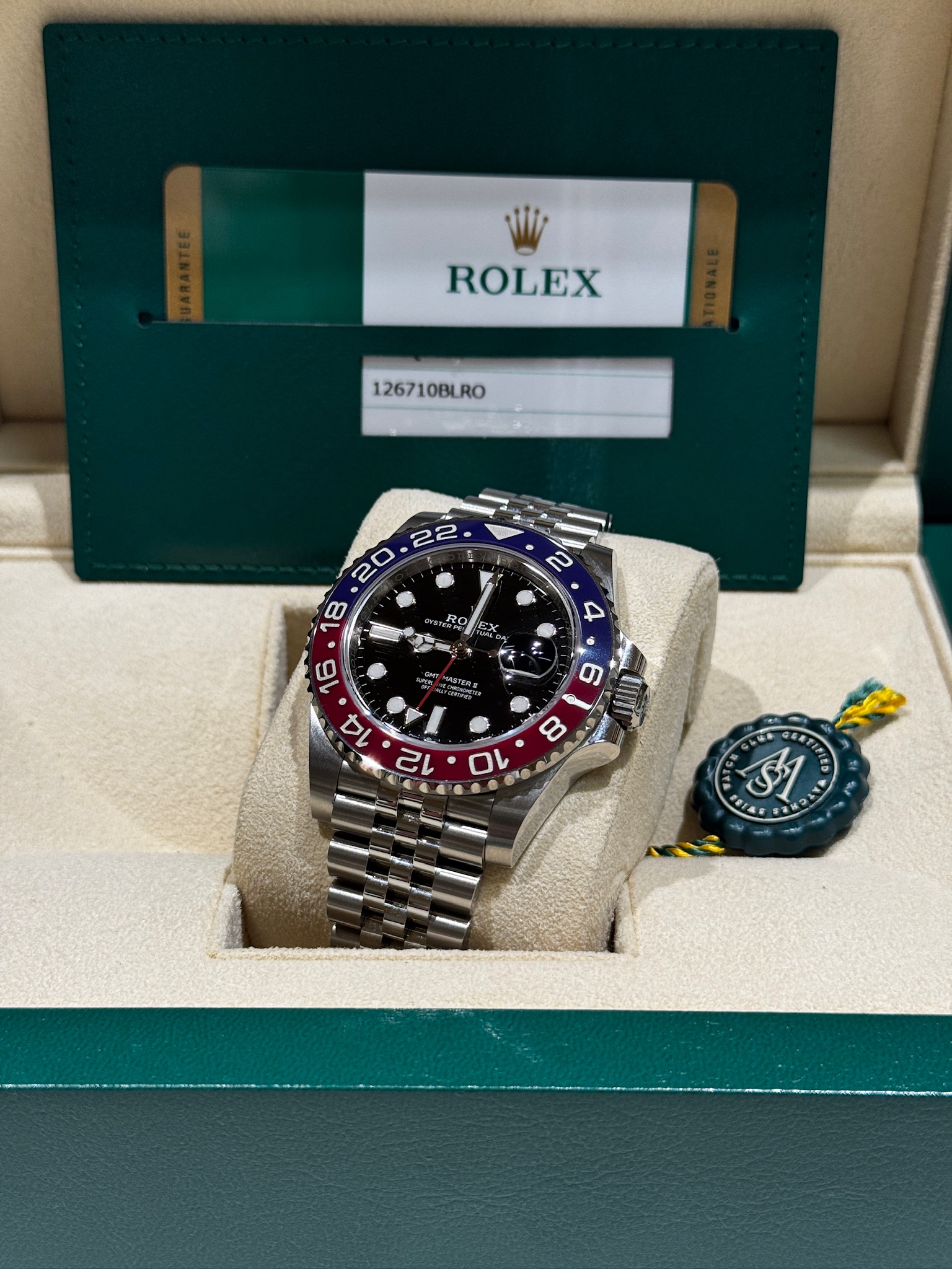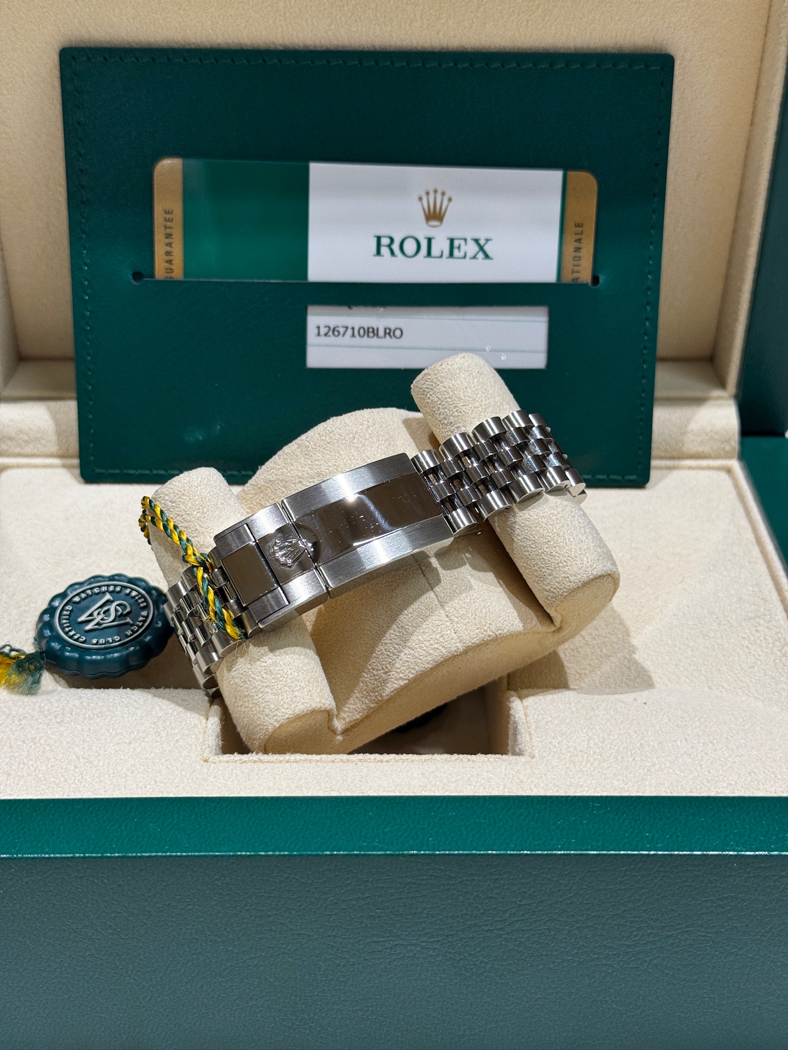 The Rolex GMT-Master II 126710BLRO, also known as the “Pepsi”, is a watch that combines style, functionality, and a rich history. Crafted from Oystersteel, it features a black dial with Chromalight display for exceptional legibility. The watch’s bidirectional rotatable 24-hour graduated bezel is adorned with a two-colour Cerachrom insert in red and blue ceramic, giving it its iconic “Pepsi” nickname.